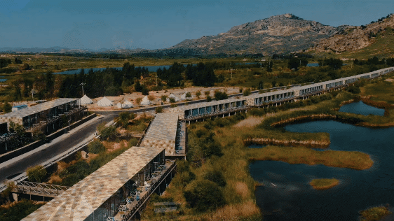每个房间都配备了私属观景露台和视野极佳的落地窗,超惬意的莫过于躺在床上便能饱览沙海的壮丽景色,轻松欣赏到窗外的沙丘、湖泊、湿地,偷得一日轻闲。