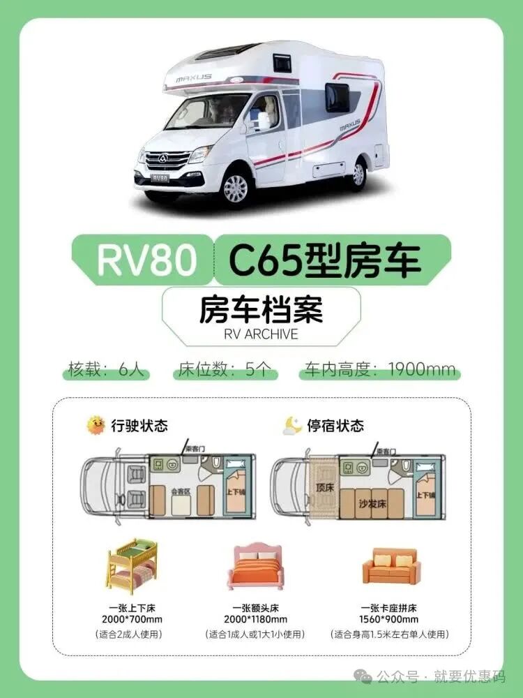 全部统一大通RV80 C型房车(6座5卧)!比酒店更自然、比露营更安适,孩子舒心,家长放心。拒绝特种兵旅行的焦虑。把疲惫的车程时间转化成了开展活动的娱乐时间,获得层次更加丰富的旅行体验。
