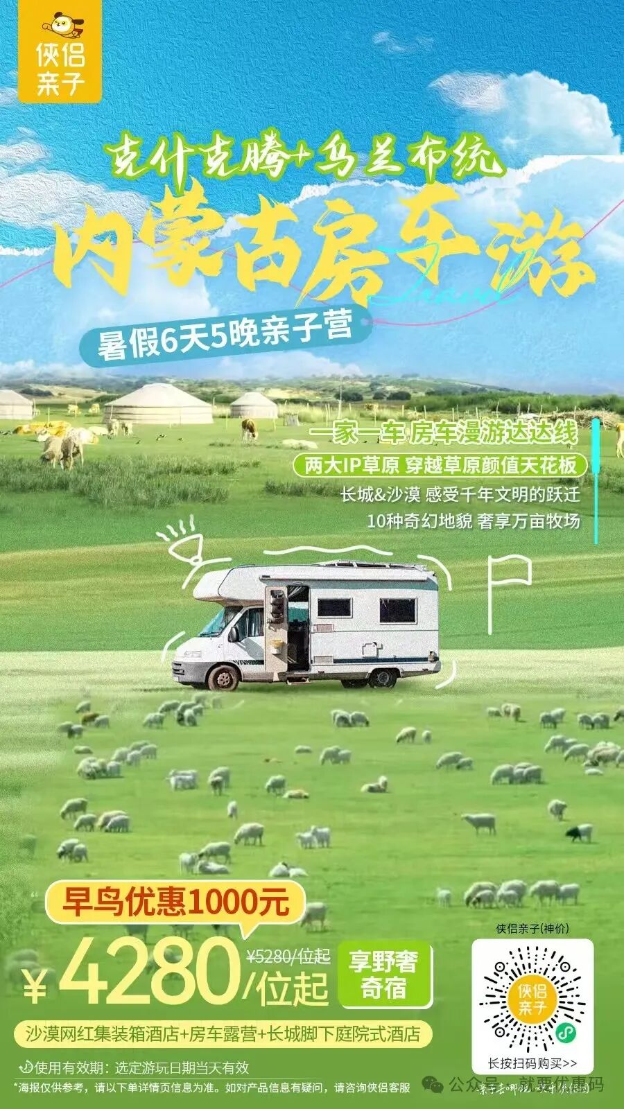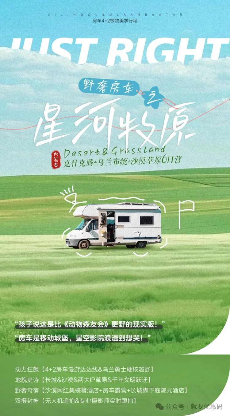 早鸟优惠1000元!暑假【野奢内蒙古房车亲子游】克什克腾+乌兰布统+沙漠草原!一家一车,达达线无人机航拍,穿越草原颜值天花板