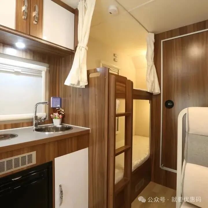 房车内部配有独立洗手间、小型冰箱等常用生活设施,妈妈随时化妆换衣服,也不用再担心找不到厕所的尴尬~