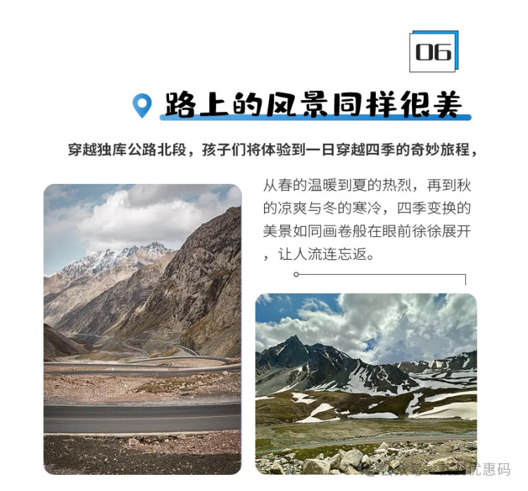 早晨,我们将换乘7座商务车,技术娴熟的司机带着我们踏上独库公路,启程翻越天山之旅。独库公路是从独山子到库车的一条"天路",也称"英雄之路",为了修筑这条公路打破南北疆的交通阻碍,从1964年开始批准建设直到1983年才建成验收,前后牺牲了168名建设者,因此在乔尔玛专门建设了纪念园来纪念这些烈士。由于气候原因,独库公路每年只在6月到10月开放半年左右。