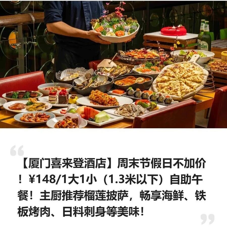 嗨,各位厦门的小伙伴们!今天要分享一个我最近挖到的宝藏自助餐——厦门喜来登酒店的周末自助午餐!148元就能1大1小(1.3米以下),周末节假日还不加价,这性价比在五星级酒店里真的很难得!